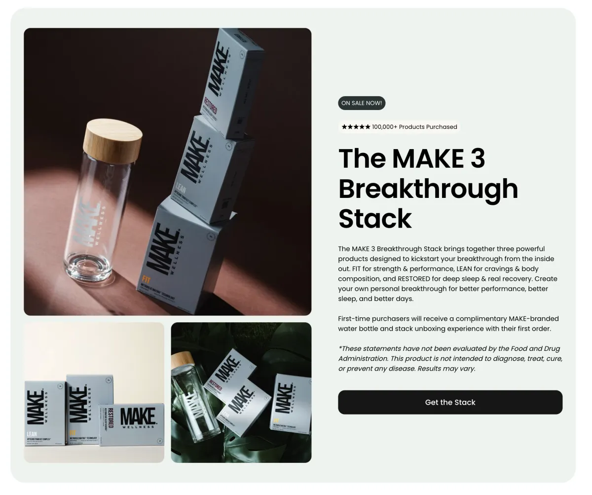 The MAKE 3 Breakthrough Stack combines three powerful products to help you achieve a breakthrough from the inside out. FIT for strength & performance, LEAN for cravings & body composition, and RESTORED for deep sleep & real recovery. Achieve your own personal breakthrough for improved performance, enhanced sleep, and better days.